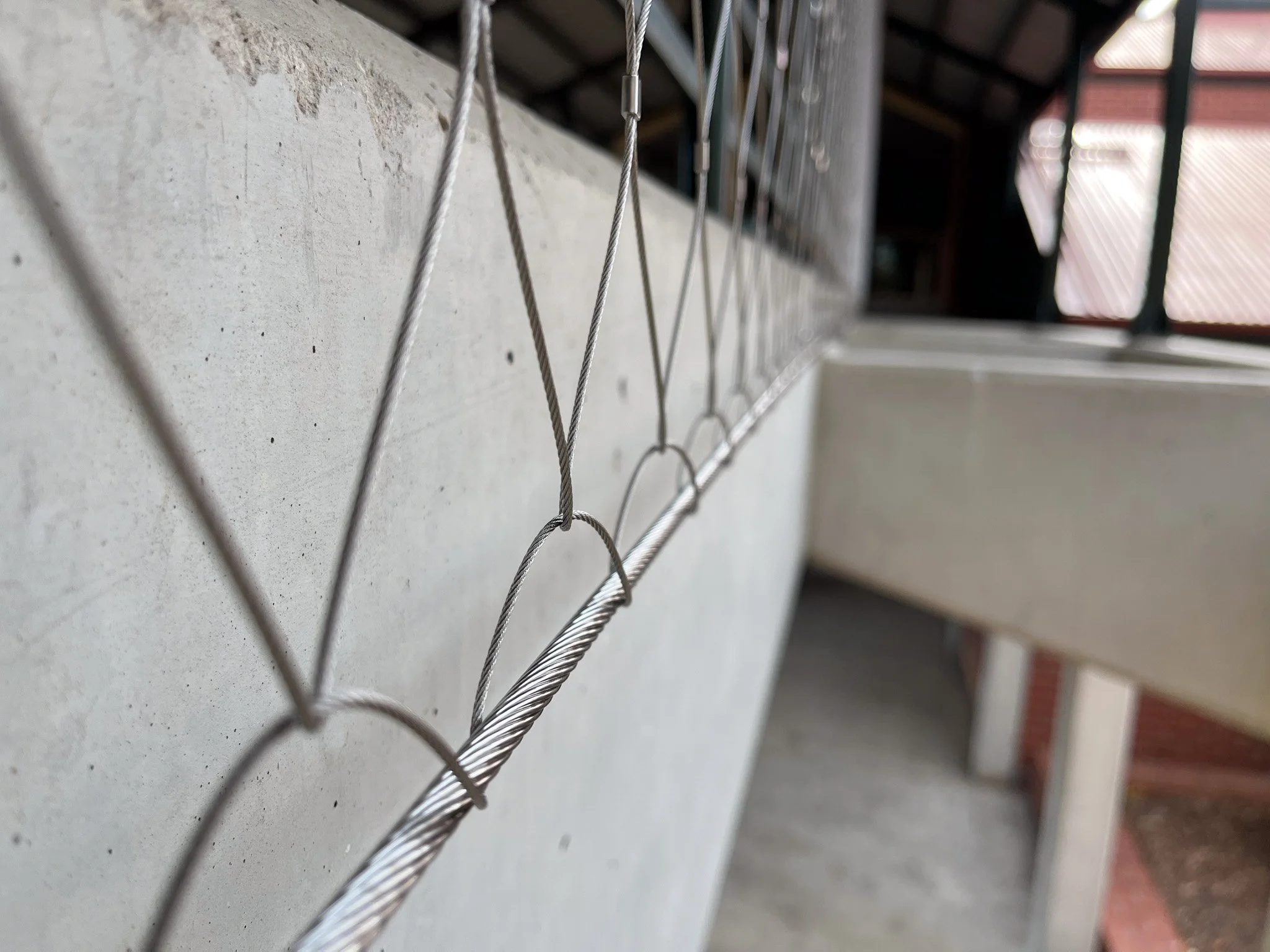 Bespoke installed Flexi-mesh barriers to both sides of the boarding house walkway. With limited fixing options available, our team fabricated custom brackets to ensure the mesh and perimeter cables remained in the same plane and clear of the railing. AWG stand-offs and perimeter cables were incorporated to deliver strength and stability without compromising the design intent.