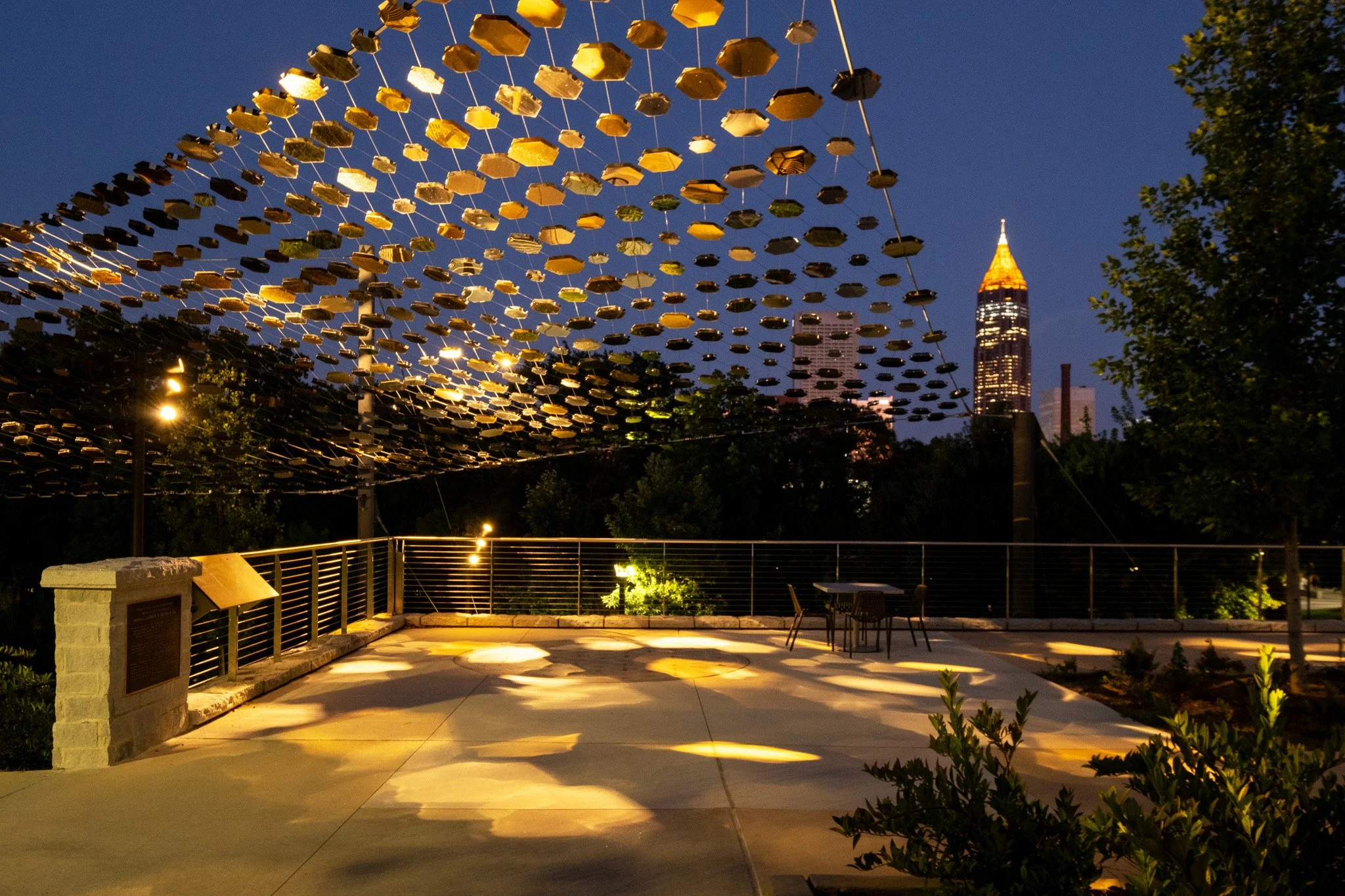 A highly customised cable and artwork canopy installed for Georgia Tech. Precision rigging, international collaboration, and complex detailing brought this landmark project to life.