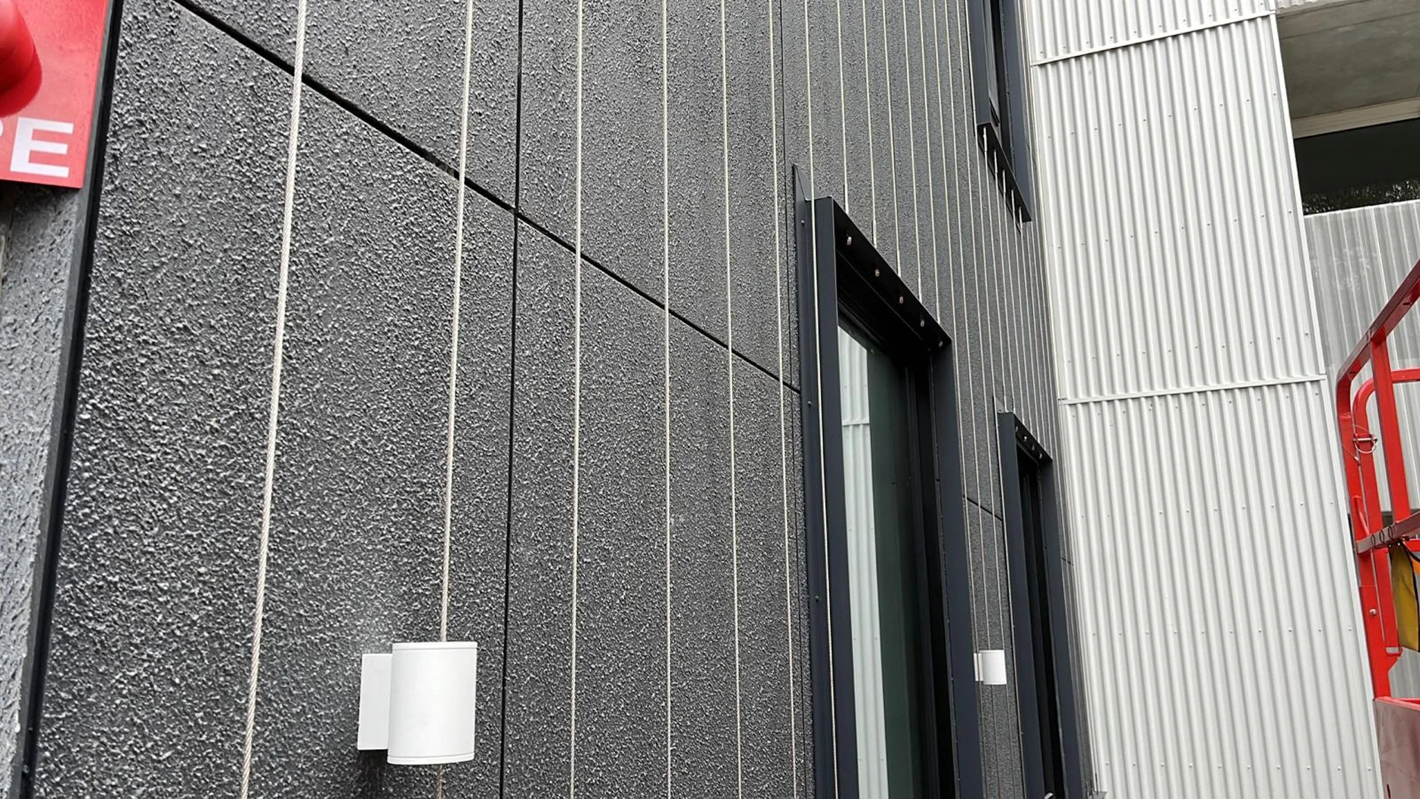 Installation involved scaffolding for internal works and a tracked scissor lift for external access.