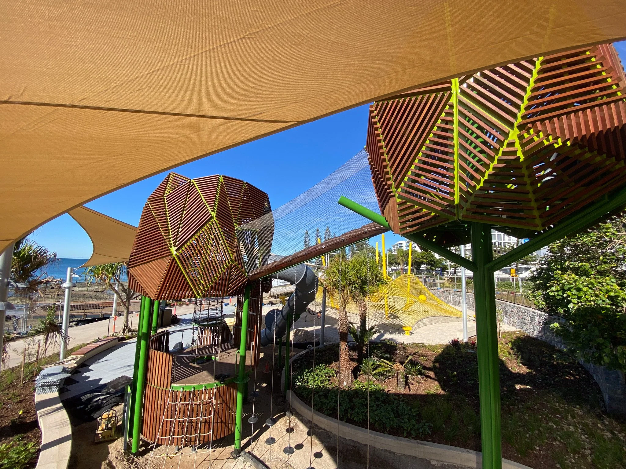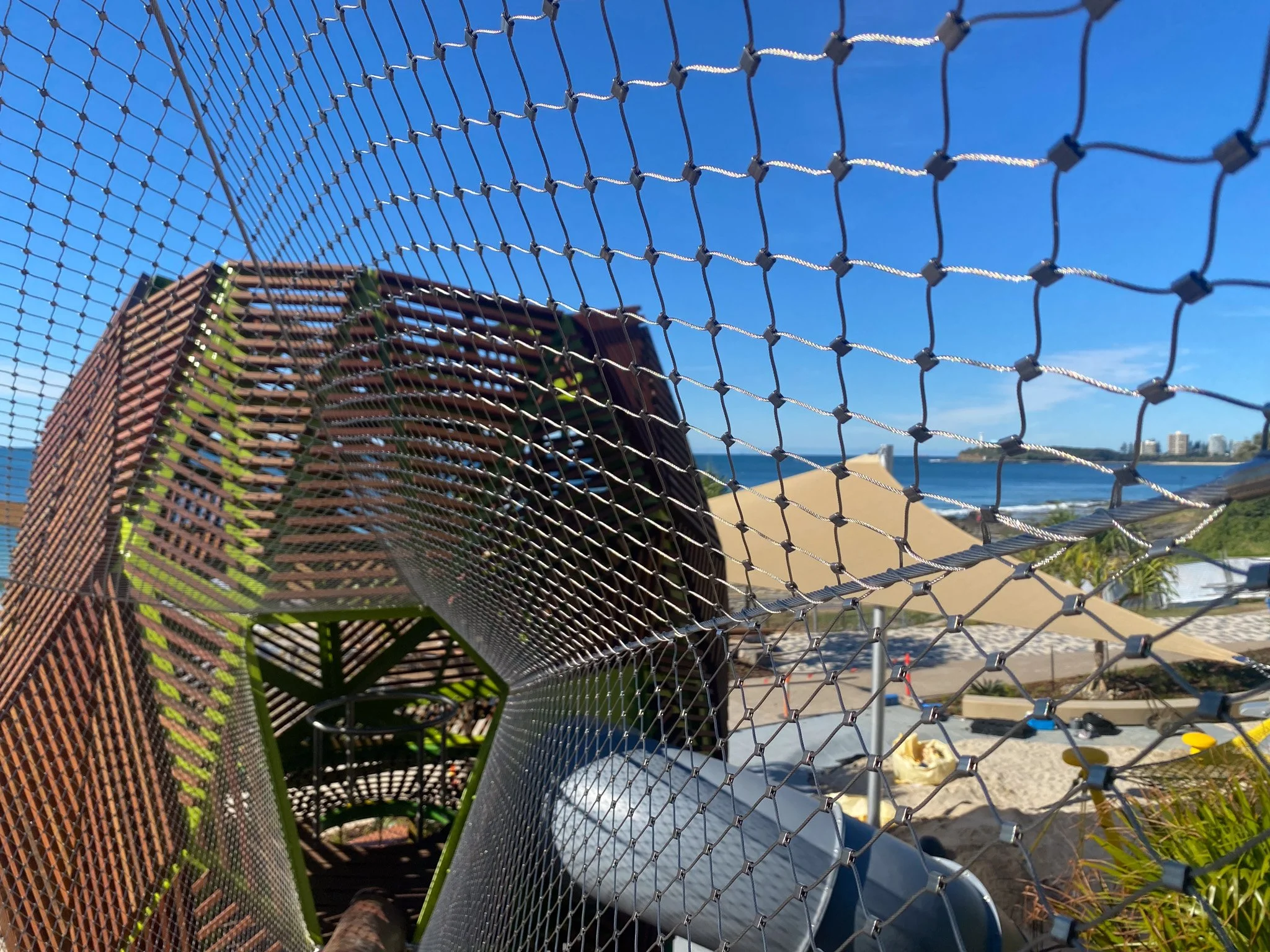 Custom Flexi-mesh barriers installed for the Mooloolaba Foreshore Playground, engineered for coastal durability and playful design.